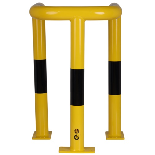HOEKBESCHERMER VAN GEGALVANISEERD STAAL MET 3 VOETPLATEN, GEEL GEPOEDERLAKT. 12 BOUTEN NODIG PER MONTAGE. NIET INBEGREPEN. K0351: 350x600x600xØ76mm. K0352: 600x600x600xØ76mm.. K0353: 1200x600x600xØ76mm. K0354: 540x555x800xØ76mm.