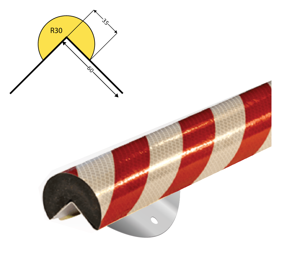 Knuffi retroflecterende hoekbescherming TYPE A+ uit polyurethaanschuim met RVS muurbevestiging. Lengte 1meter. Geel/zwart & rood/wit.