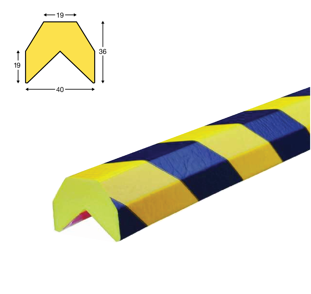 Knuffi hoekbeschermingen TYPE AA polyurethaanschuim zelfklevend met niet afgeronde bovenkant. Lengte 1 & 5 meter. Geel/zwart.