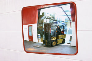 Rechthoekige industriespiegels uit helder onbreekbare polycarbonaat, met rode polyesterframe. Voor binnen en buiten gebruik. Inclusief bevestigingsbeugel 48-90mm, geschikt voor montage op muur of paal 76mm. Gebruikerafstand: TMIPC4060 0-15m. & TMIPC6080-20m.